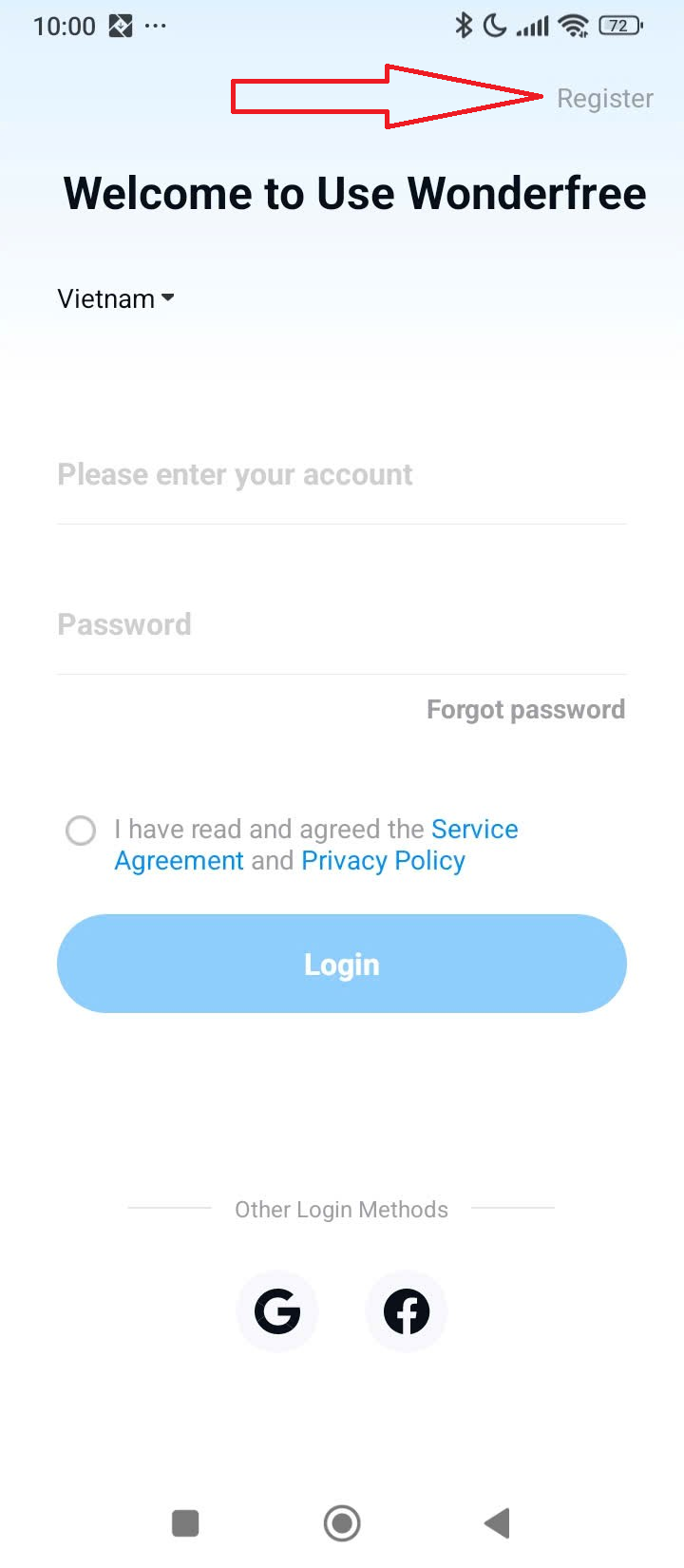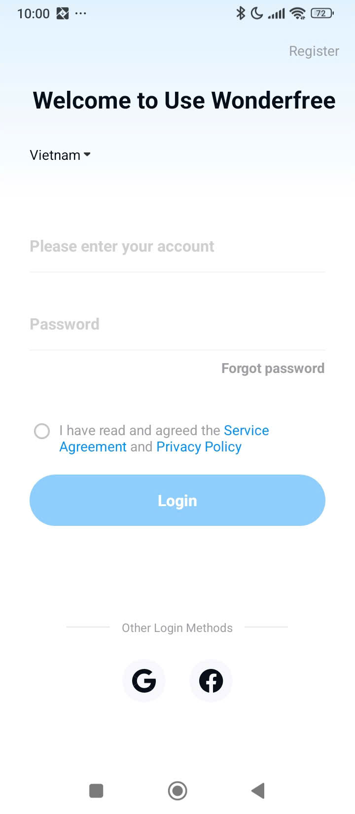 Sau khi cài đặt xong, hãy mở ứng dụng Wonderfree và tiến hành đăng ký tài khoản mới hoặc đăng nhập nếu bạn đã có tài khoản trước đó. Tài khoản này sẽ dùng để kết nối và quản lý thiết bị inverter của bạn.