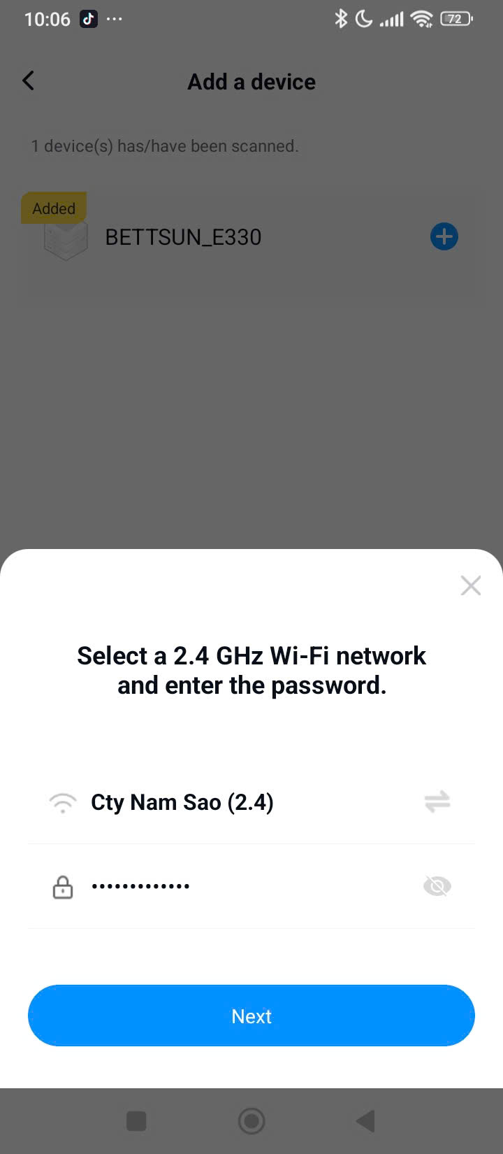 Trong giao diện ứng dụng, chọn chức năng thêm thiết bị và làm theo hướng dẫn để kết nối inverter với mạng WiFi. Nhập thông tin mạng WiFi của bạn để hệ thống tiến hành cấu hình kết nối cho inverter.