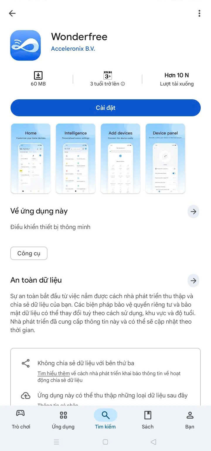 Mở CH Play đối với điện thoại Android hoặc App Store đối với iPhone, sau đó tìm kiếm ứng dụng Wonderfree. Tiến hành tải và cài đặt ứng dụng về điện thoại để quản lý inverter từ xa.