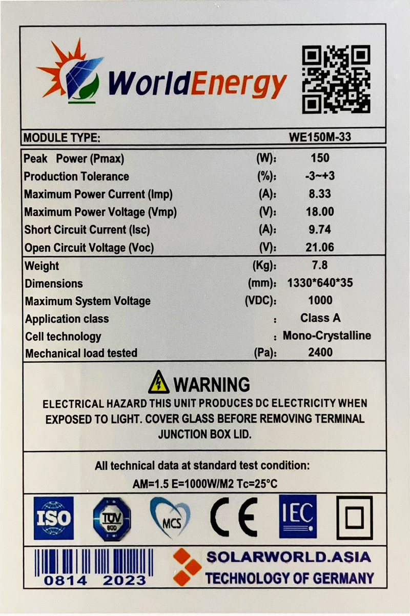 Thông số kỹ thuật TẤM PIN NĂNG LƯỢNG MẶT TRỜI MONO 150W WORLDENERGY