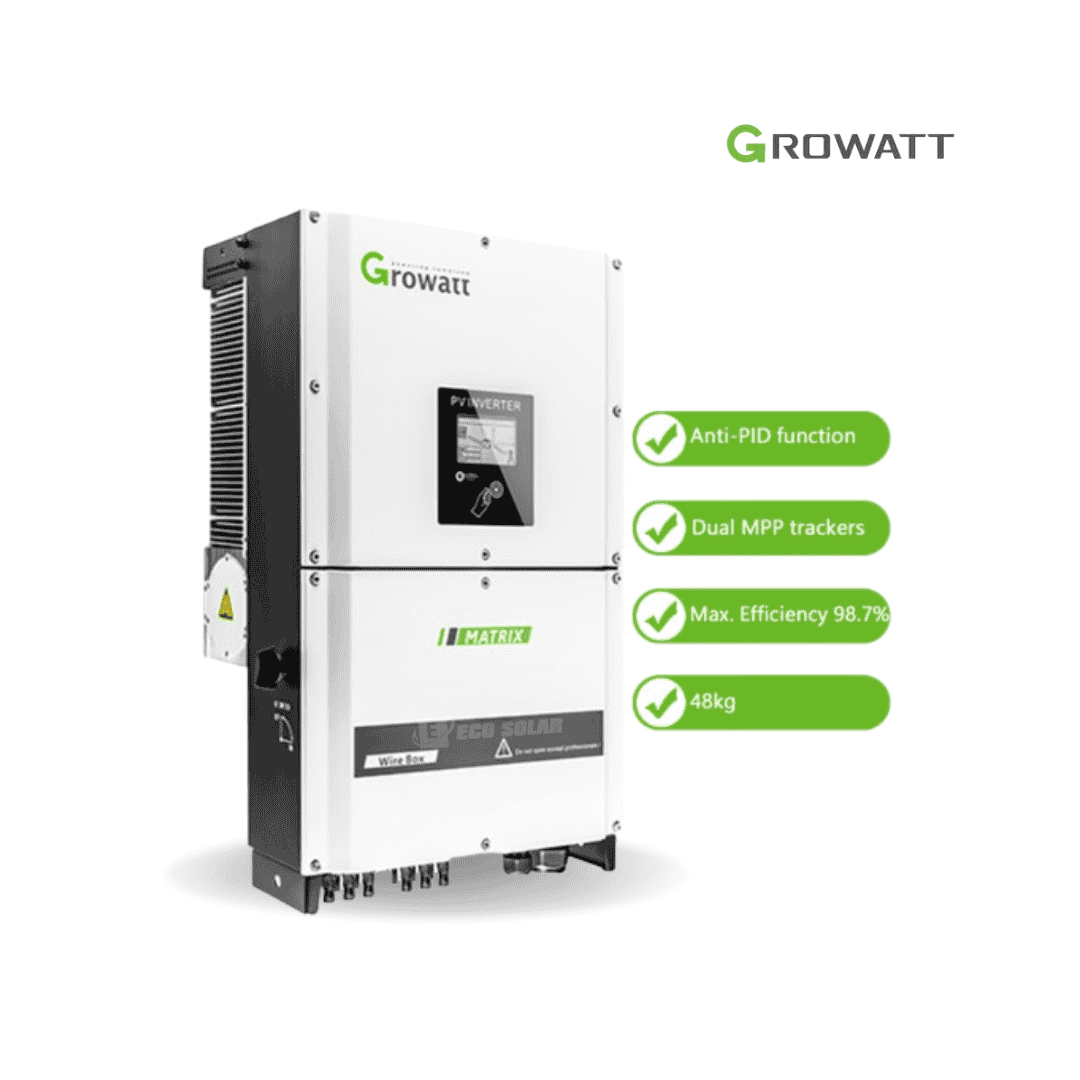 - Biến tần growatt 60kw Sử dụng công nghệ tiên tiến MPPT giúp dò điểm công suất tùy theo cường độ ánh sáng mặt trời.