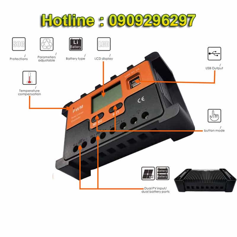 – Điện áp định mức: Tự động 12V/24V/48V – Điện áp tối đa PV: 100V – Dòng tải: 60A – Công suất: hệ 12V – 720W ~ hệ 24V – 1440W ~ hệ 48V – 2880W – Hiệu suất: >90% – Đầu ra USB: 5V/2A*2 – Nhiệt độ làm việc: -15 ~ + 50°C – Kích thước: 175 * 118 * 44mm – Trọng lượng: 438g. |