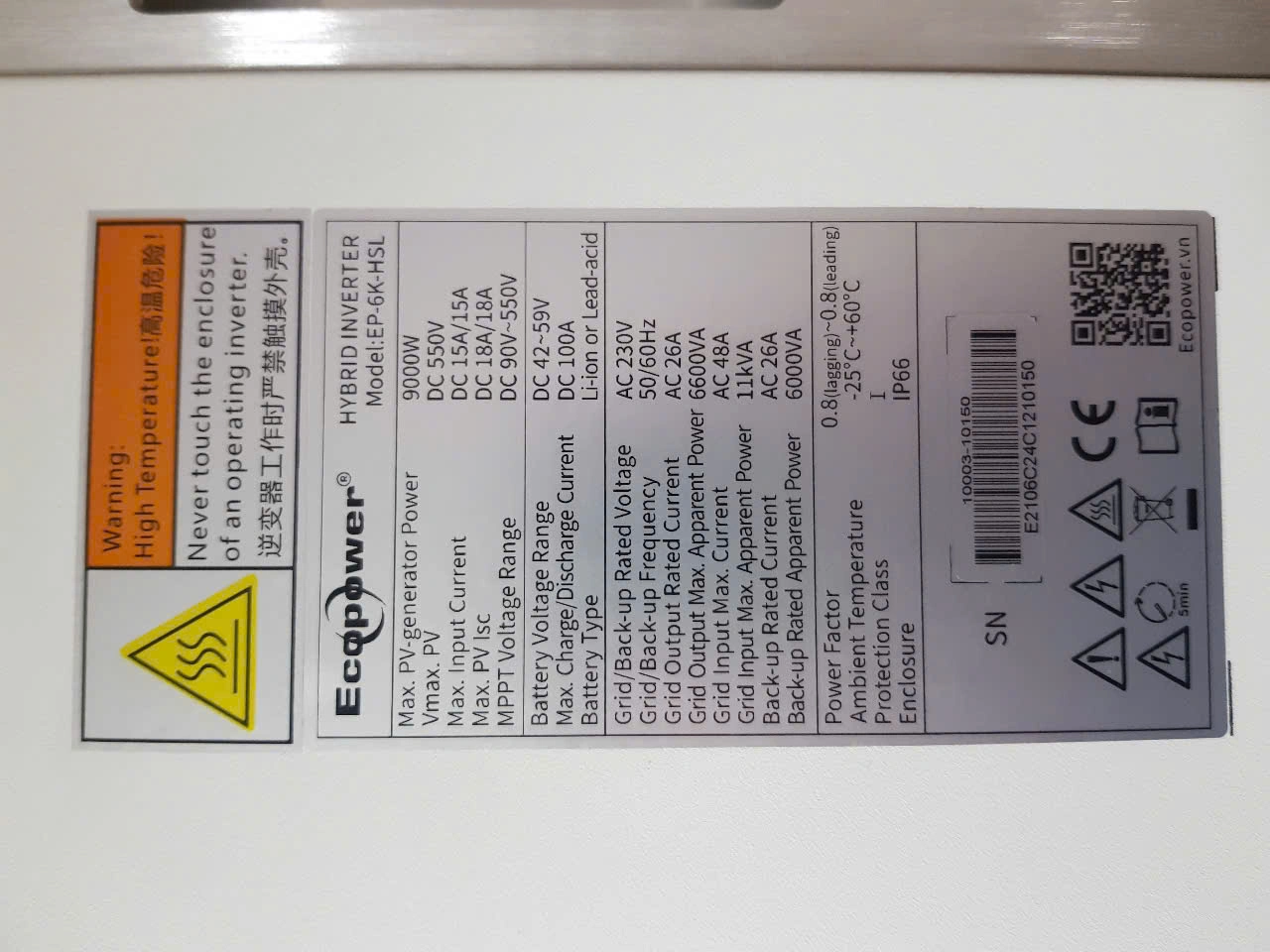 Thông số kỹ thuật chi tiết của Inverter Hybrid Ecopower 6KW HI-6K-SL được liệt kê trong bảng sau: