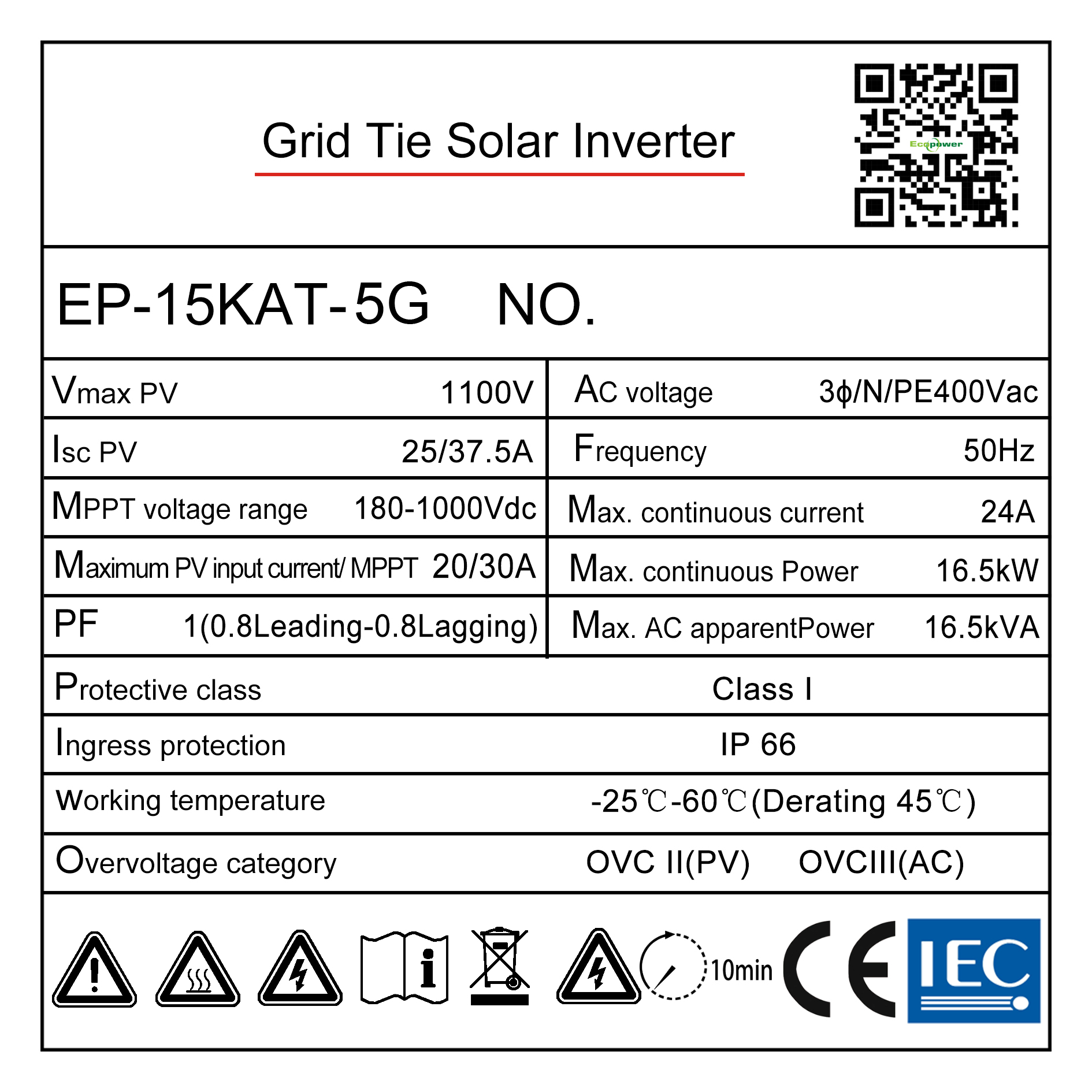 Ecopower EP-15KAT-5G là inverter hòa lưới 3 pha công suất lớn, phù hợp cho hệ thống điện mặt trời thương mại, nhà xưởng và công trình cần hiệu suất cao.
