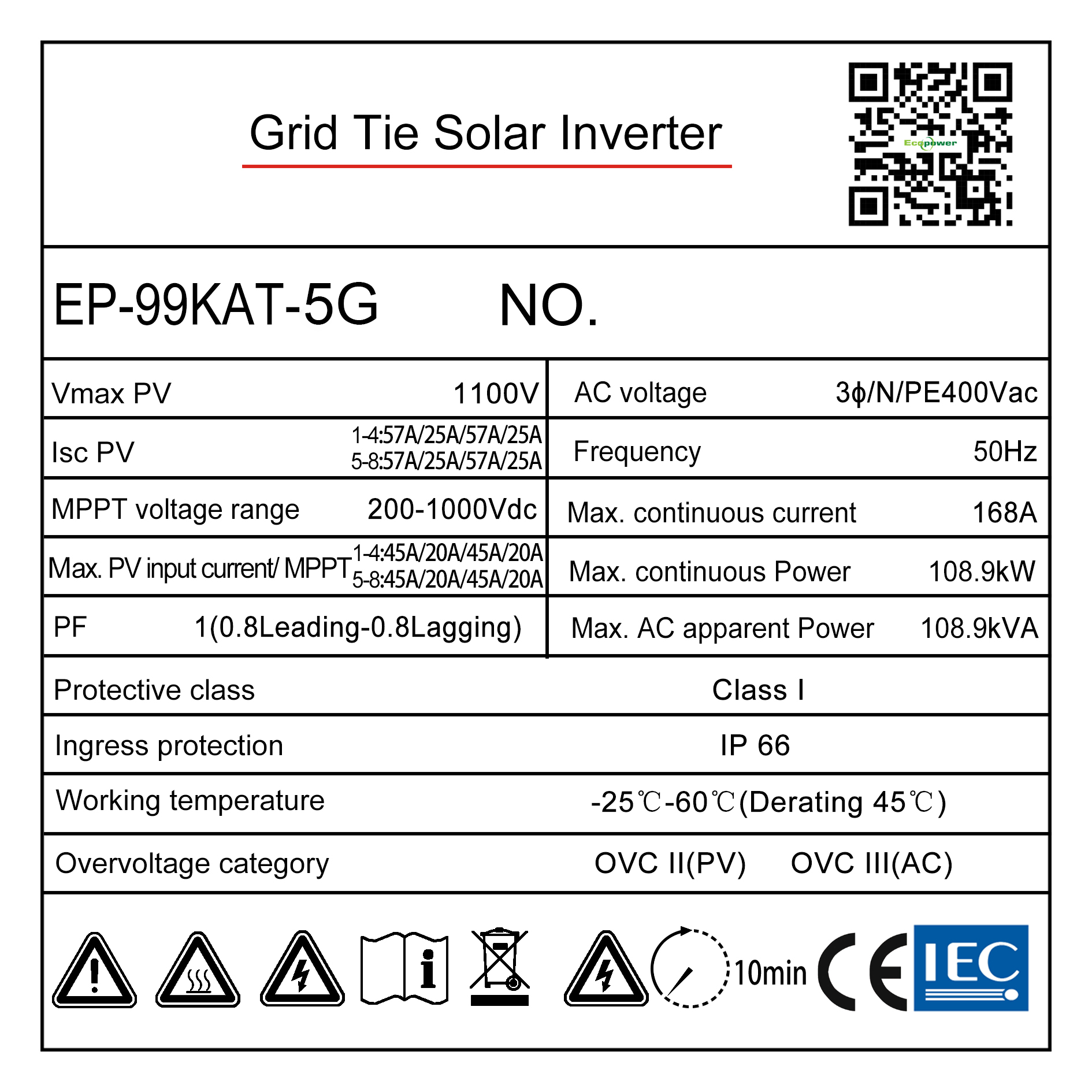 EP-99KAT-5G là lựa chọn phù hợp cho các dự án điện mặt trời 3 pha cần inverter 99kW công suất lớn, vận hành ổn định, dễ tích hợp, chịu môi trường ngoài trời tốt, hỗ trợ dải điện áp làm việc rộng và đáp ứng nhu cầu khai thác liên tục cho hệ thống thương mại – công nghiệp.