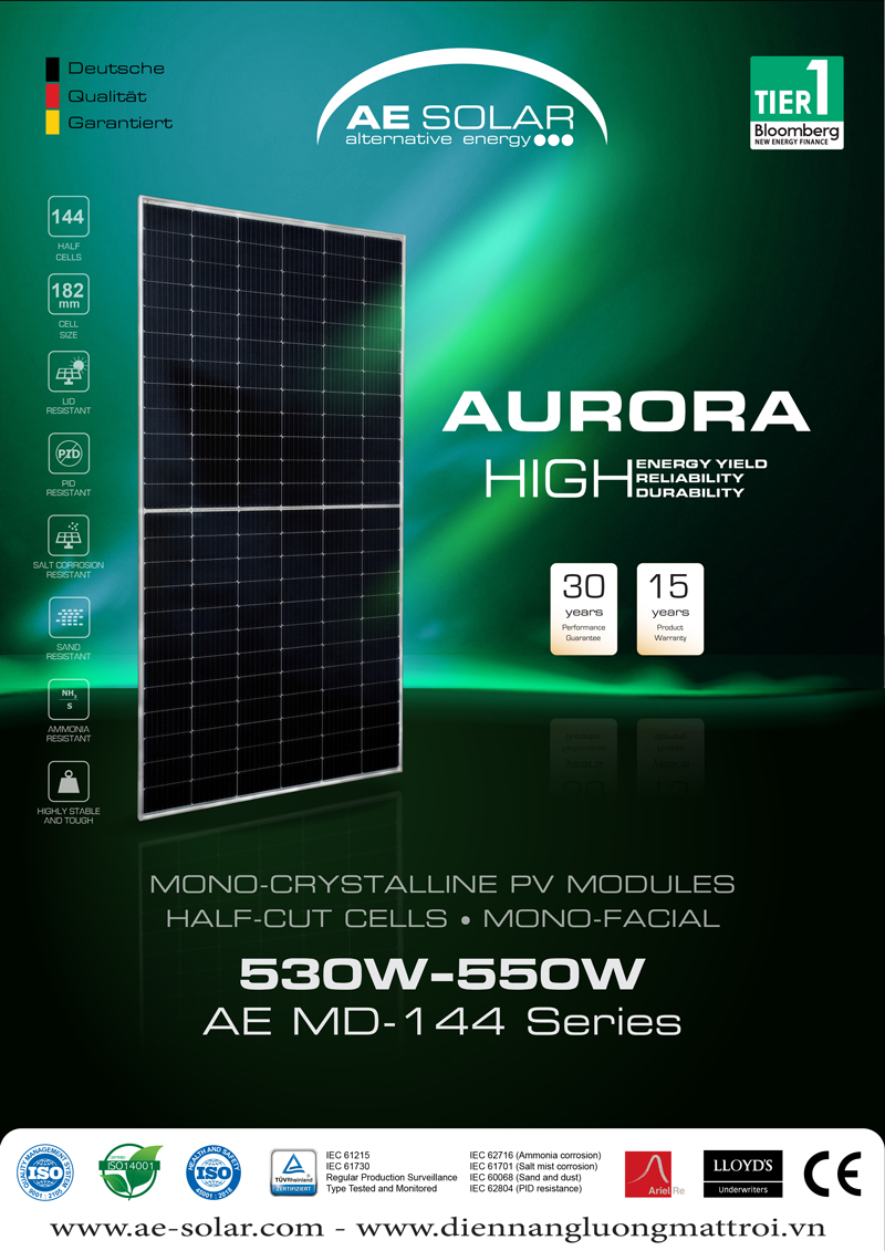 - AE Solar đảm bảo chất lượng cao và hiệu suất tốt nhất của các mô-đun quang điện do chỉ sử dụng các nguyên liệu và linh kiện cao cấp từ các nhà cung cấp Tier 1 Hạng A đảm bảo hiệu suất hoạt động trên 80% trong 30 năm và 12 năm về các vấn đề do lỗi nhà sản xuất. Dựa trên các tiêu chuẩn quốc tế thông qua các bài kiểm tra về mức độ hoạt động với tần suất cao và chịu được trong môi trường ngoài trời khắc nghiệt.