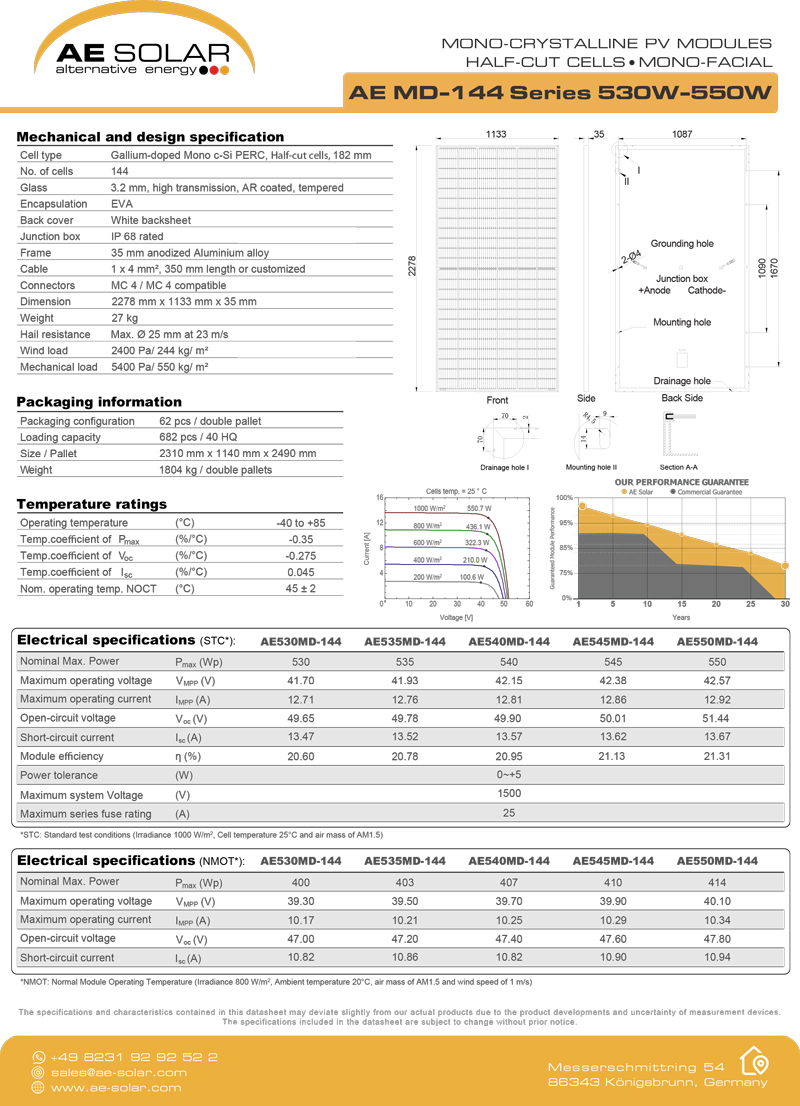 Thông số kỹ thuật Tấm pin năng lượng mặt trời AE SOLAR 530W